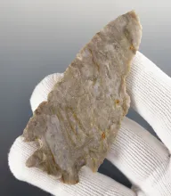 3" Coshocton Flint Kirk Cornernotch with a Shaft Scraper worked into one blade edge, Ohio. |