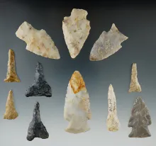 Group of 11 assorted points and drills found in Washington Co., Ohio. Largest is 2 9/16". |