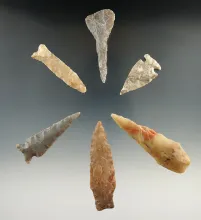 Group of six assorted Texas points, drills and knives, largest is 2 13/16". |