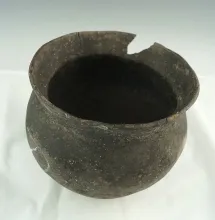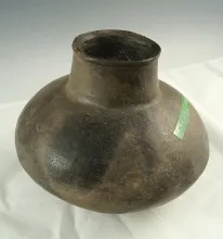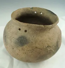 6" wide Mississippian jar with suspension holes at rim. |