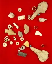 Nice assortment of flint artifacts, drilled stone, shell beads and stone fetish, largest is 2 7/16". |