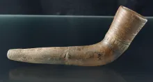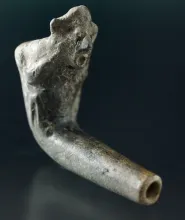 Miniature 2" long Face Pipe with minimal restoration to the bowl and mended at the elbow. 400.00