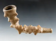 Unique! 3 1/4" Long Iroquois Clay Pipe with zoomorphic and human maskette effigy. New York. |