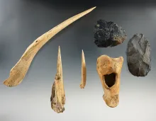 Group of six Reeves site bone and Flint artifacts found in Ohio. Largest is 6 1/2". |