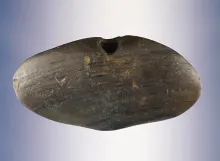 4 7/16" Bannerstone found in Pickaway Co., Ohio. Made from nicely patinated Banded Slate. |