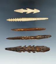 Set of five bone projectiles and harpoon tips found in the Pacific Northwest, largest is 3 9/16". | WASHINGTON | 85.00 | |