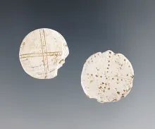 Pair of Shell Runtees with incised design of cross lines with dots. Great Gully Site, New York. |