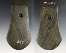 5 3/8" Slate Gorget that is heavily patinated with a couple of nicks. Found in the Ohio area. |