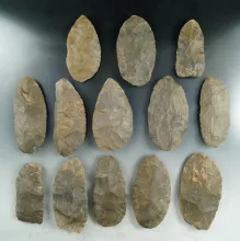 Pribble Cache! 13 nicely flaked Cache Blades all found together in Covington, Indiana - Hornstone. |