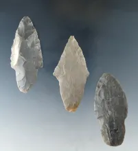 Set of three Hornstone Nodena points, largest is 2 11/16". Found in Morgan Co., Indiana. |