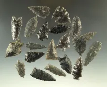 Group of 20 assorted obsidian arrowheads found in Nevada. Largest is 2 13/16". |