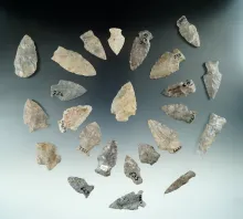 24" Assorted arrowheads, mostly Onondaga Flint, found near Belfast, Allegheny Co., New York. |