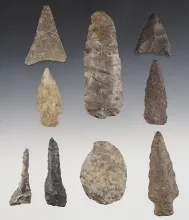 Set of 9 points and knives found close to Lamoka Lake, Schuyler Co., New York. Largest is 3 1/2". |