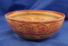 Nicely decorated 6 1/2" Wide Mayan Bowl depicting underworld swimmers. |