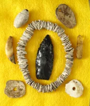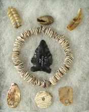 Nice group of artifacts including a 1 5/8" Sidenotch point, assorted drilled beads and pendants | CALIFORNIA | 45.00 | |