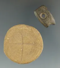 Pair of miniature relics. One is a 1 1/2" Diameter Sandstone Double Cupped Discoidal. |