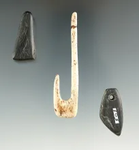 Bone fishhook and two Cannel coal artifacts found at a site in southern Ohio. Hook measures 2 5/8". |