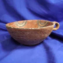 6 3/8" wide pre-Columbian pottery vessel that is solid with no restoration found in Peru. |