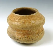 4" wide x 3 1/4" tall Pre Columbian gourd effigy pottery jar. One reglued rim chip, no restoration. |