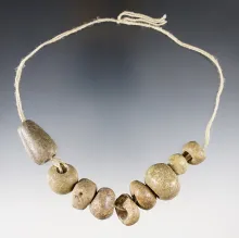 Strand of nine drilled stone Mescala beads found in Guerrero, Mexico. Largest is 1 1/8". |