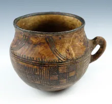 6 1/4" tall x 5" wide single handle Berber pottery vessel from Morocco. |