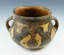 8 1/2" wide x 5 1/2" tall well styled dual handle Berber pottery vessel from Morocco. |
