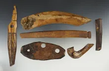 Set of six assorted bone and ivory artifacts found in Alaska, largest is 7". |