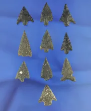 Large group of 10 assorted basalt arrowheads, largest is 1". California. |
