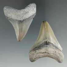 Excellent pair of Megalodon sharks teeth, largest is 2". Found in the "Bone Valley" area, Florida. |