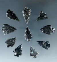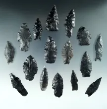 Group of 16 assorted Obsidian arrowheads found in Nevada, largest is 2 1/16". |