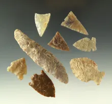 Set of eight assorted arrowheads and knives found in North Dakota, largest is 2 7/8". |