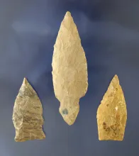 Set of three assorted Tennessee points including a 3 3/16" Turkeytail found near Dickson TN. TENNESSEE 65.00