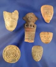 Set of assorted Pre-Columbian pottery figures, stamps and beads found in Mexico. |